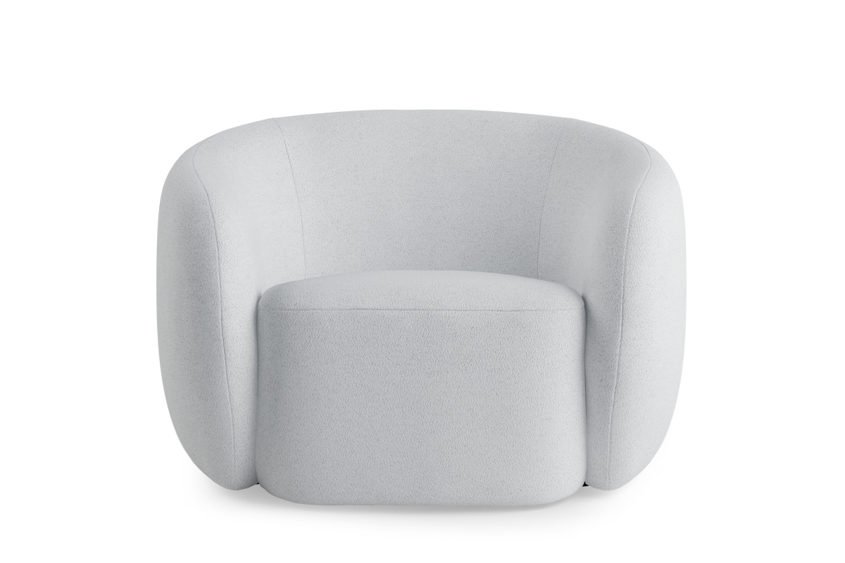 Sofa i fotel, otulone miękką, teksturowaną tkaniną bouclé zapraszają do zatopienia się w ich przytulnej strukturze, gdzie każdy detal – od zintegrowanych podłokietników po jednoczęściowe siedzisko – został przemyślany nie tylko pod kątem estetyki, ale i głębokiego komfortu.